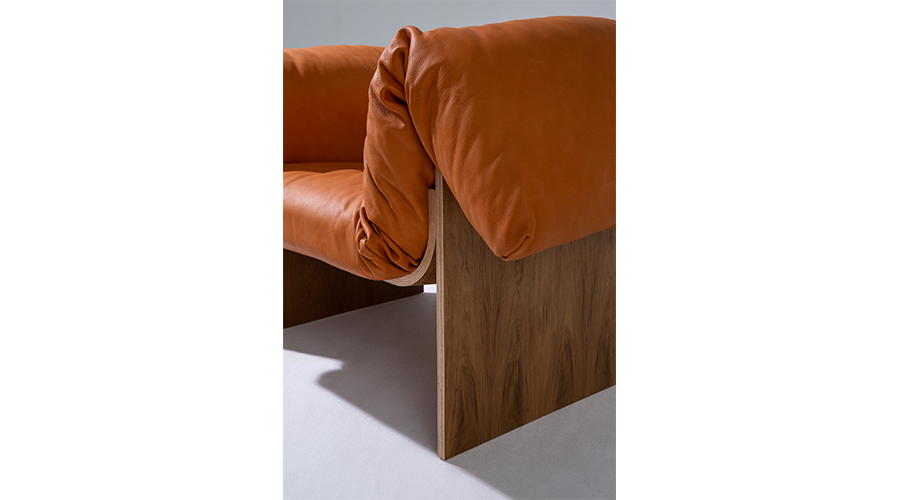 O harmonioso contraste entre as rígidas linhas dos apoios em lâmina natural e o aspecto maleável e orgânico do couro no assento define o design da poltrona Soft, que une conforto e estética.